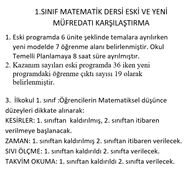 1.Sınıf > Matematik > Matematik Yeni Ve Eski Müfredat Karşılaştırma