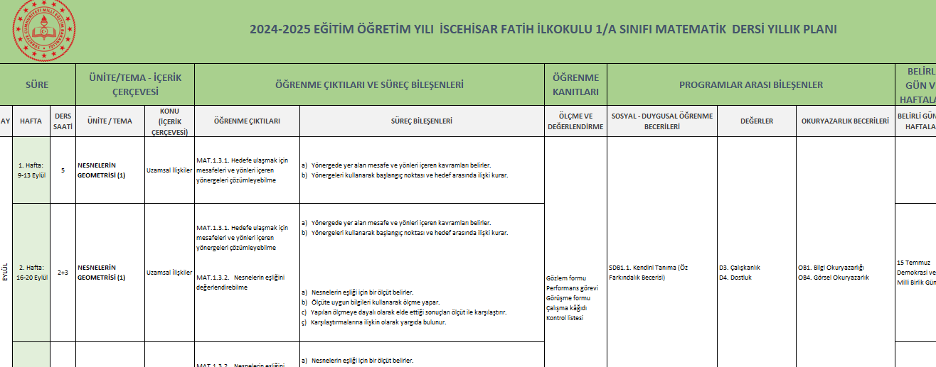 Dosya Adı : 1.Sınıf Matematik Yıllık Planı(2024-2025)