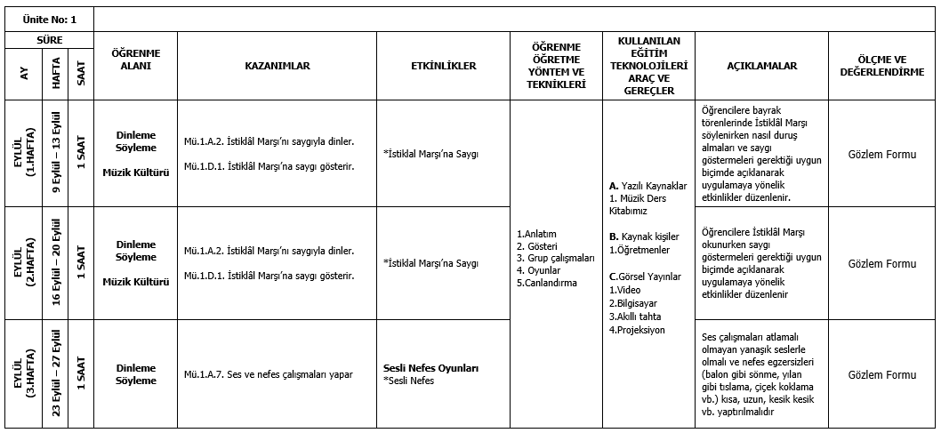 1.Sınıf > Müzik > 1.Sınıf Müzik Yıllık Planı