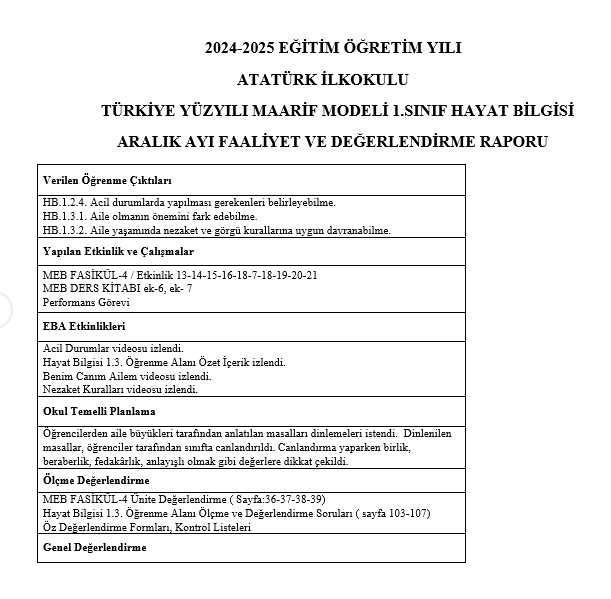 Dosya Adı : Hayat Bilgisi Dersi Aralık Ayı Değerlendirme